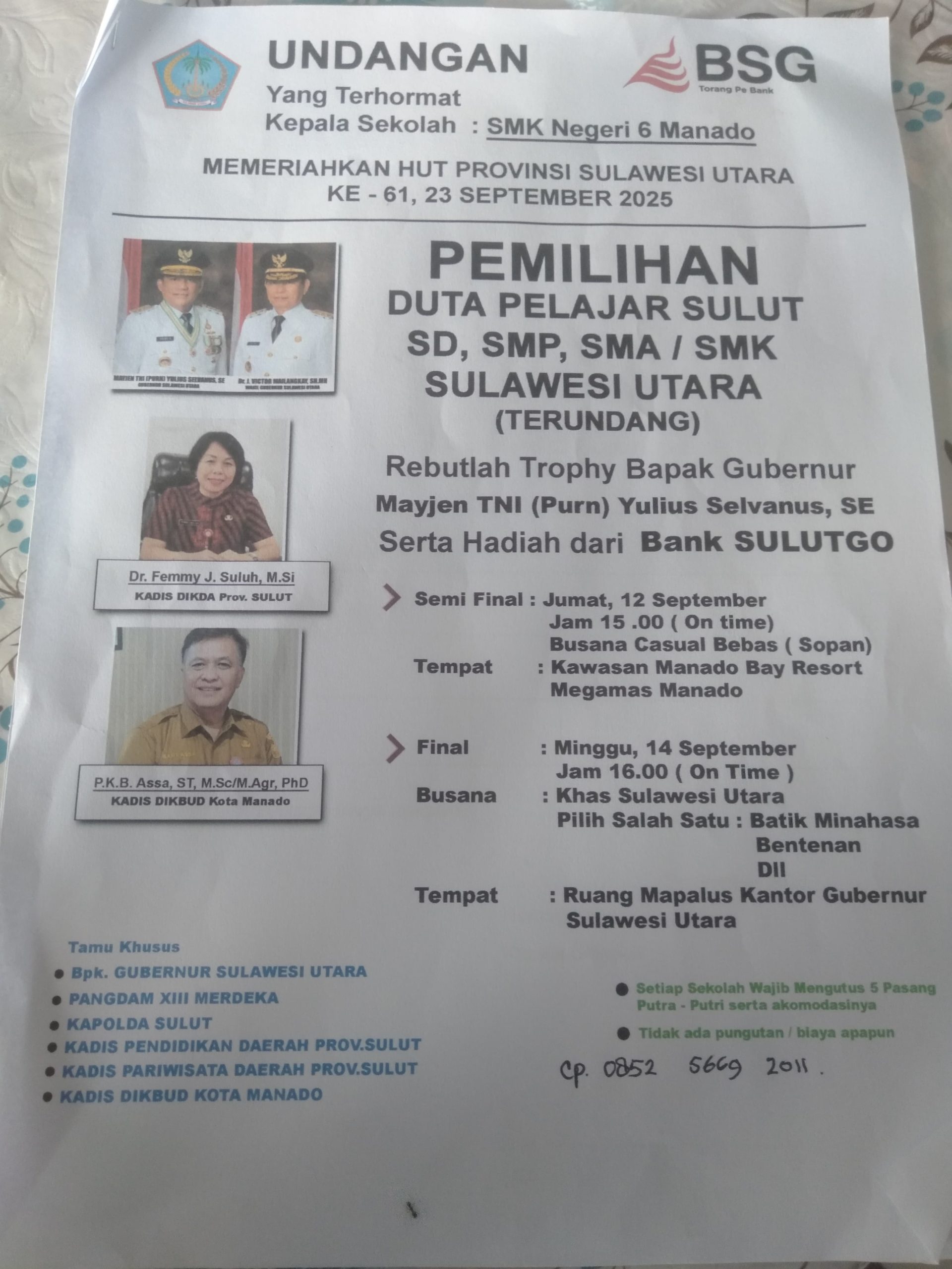RadarManado.com – Pemerintah Provinsi Sulawesi Utara angkat bicara terkait beredarnya flyer kegiatan Pemilihan Duta Pelajar Sulut yang dikaitkan dengan perayaan HUT ke-61 Provinsi Sulut.